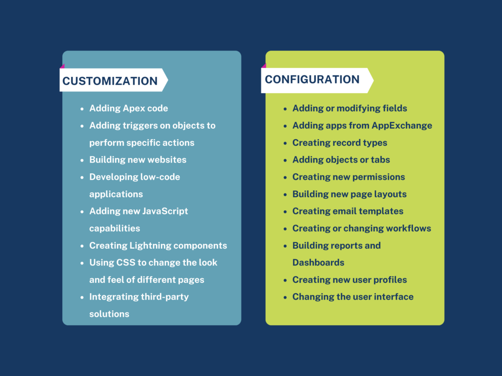 The main difference between configuration and customization in Salesforce is how you use the platform. You’re using configuration if you’re performing a process or function within your current CRM system. If you’re adding new functionality or features that aren’t currently available as a default, you’re using customization.